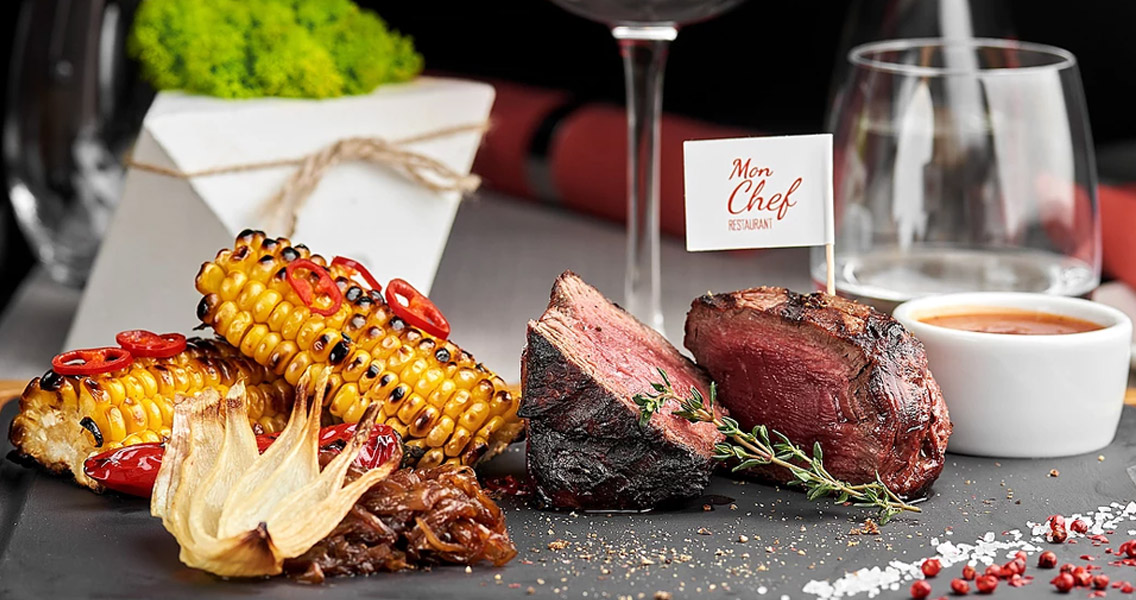 В ресторані Mon Chef ми подаємо класичні стейки з мармурового м'яса, популярні в усьому світі: ароматний «Нью-Йорк» , ніжний «Філе-міньйон» та соковитий «Рібай».